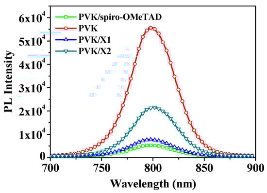 To evaluate the hole-extraction capability of new HTMs, we fabricated bilayer devices (glass/perovskite/HTM) by spin coating X1 or X2 on state-of-the-art mixed-cation-based perovskite films and measured their steady-state photoluminescence (PL) spectra with bare perovskite thin film as a control. Figure 5 showed the steady-state photoluminescence spectra of perovskite with and without HTMs. Pure perovskite film without the HTM layer showed a strong emission and the PL signal was fundamentally reduced, which is due to quenching the photo-generated charge carriers when the HTM was coated on the perovskite layer. X1 exhibited high efficiency in quenching the excited perovskite when compared with X2, which could be attributed to its unsuitable alignment of the HOMO level for the maximum valence band of the perovskite. The result indicates that the hole transfer of X1 with higher quenching efficiency is more efficient than that of X2 and is also beneficial for PSC performance. In addition, spiro-OMeTAD is the most effective at quenching the excited perovskite among the three HTMs.