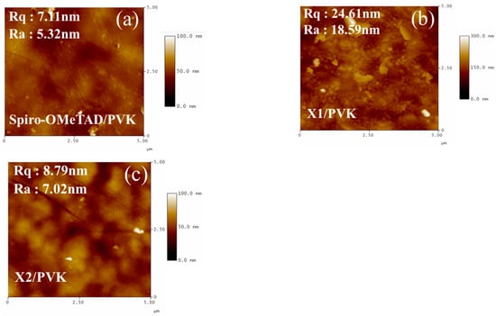 The film-formation properties and film morphologies of X1, X2, and spiro-OMeTAD were investigated using a scanning electron microscope (SEM) and atomic force microscopy (AFM). As Figure 6a–c present, the scanning electron microscope (SEM) images were executed and the surface morphology of the HTM layer was investigated. The SEM images of X2 and spiro-OMeTAD surfaces revealed smooth and good coverage on top of the perovskite layer, while some dots could be observed in the film of X1. Pinholes and particles on HTM film are ineffective at protecting the perovskite from water attacks and may adsorb more water from the air. Furthermore, pinholes may lead to a loss of the charge transporter in the device due to the direct contact between the perovskite and metal electrodes. The compact and uniform HTM film can restrict the direct contact of perovskite with Au, moisture, and oxygen, which is helpful to improve the device’s PCE and stability. In general, uniform and smoother HTM films can reduce charge recombination at the interface, which is beneficial to the improvement of device performance [71]. As shown in Figure 7, the X1 HTM yielded a relatively larger root mean square (Rq) of 24.61 nm compared to X2 (8.79 nm) which could be due to the poor solubility of X1 in chlorobenzene. The X2 film exhibited a smoother morphology with the smallest root-mean-square value, which is expected to improve charge transport in the film and across process at the perovskite/hole-transport-layer interface.
