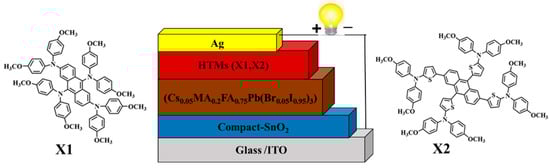 The PSCs were fabricated with the structure of ITO/SnO2/perovskite/HTM/Ag. The ITO substrate (7 Ω/square, Ruilong Optoelectronics, Miaoli, Taiwan) was washed by subsequent sonication steps in acetone, ethanol, isopropanol, and DI water, respectively. To remove organic residues from the surface, the ITO substrate was treated with UV-ozone cleaner for 15 min. The electron-transport layer, SnO2, was deposited by blade coating on the ITO glass with commercial SnO2 solution (dilute to 7%) (Alfa Aesar, Harverhill, MA, USA) at 60 °C (coating speed: 10 mm/s, gap: 200 μm) and baked on a hot plate at 155 °C for 40 min. Then, the perovskite (Cs0.05MA0.2FA0.75Pb(Br0.05I0.95)3) layer was produced using a single-step method. The mixture of 576.3 mg of PbI2 (99.9985%, Alfa Aesar (Harverhill, MA, USA), 161.2 mg of formamidinium iodide (FAI, 99.99%, FMPV®, FrontMaterials Co. Ltd., Taipei, Taiwan), 14 mg of methylammonium bromide (MABr, ECHO Chemical, Miaoli, Taiwan), 16.2 mg of Cesium iodide (CsI, Aldrich, Burlington, VT, USA) and 19.8 mg of methylammonium iodide (CH3NH3I, MAI, >98%, STAREK®, Starek Scientific Co. Ltd., Taipei, Taiwan) dissolved in 0.8 mL dimethylformamide (DMF, Tedia, OH, USA) and 0.2 mL Dimethyl sulfoxide (DMSO, 99%, Echo Chemical Co. Ltd., Miaoli, Taiwan) was stirred at 60 °C for 8 h. This solution was then spin coated on the compact SnO2 film at 1000 rpm for 10 s and 5000 rpm for 20 s and then baked on a hot plate for 10 min. Subsequently, the hole-transporting layer was spin coated at 2000 rpm for 30 s by using different HTM solutions. The HTM solutions were composed of HTM (Spiro-OMeTAD (99.93%, Rruilong, Miaoli, Taiwan): 80 mg, X1: 50 mg, X2: 50 mg), 17.5 μL lithium bis(trifluoromethanesulfonyl)imide (LiTFSI, 99.9%, Sigma-Aldrich, Burlington, VT, USA) and 28.5 μL 4-tert-butyl pyridine (4-TBP, Aldrich, Burlington, VT, USA), 1 mL chlorobenzene (CB, 99%, Tedia, OH, USA) under N2 conditions. To complete the PSC production, a 100 nm silver electrode was thermally evaporated as the top electrode with a 0.09 cm2 mask to define the active area of the device.