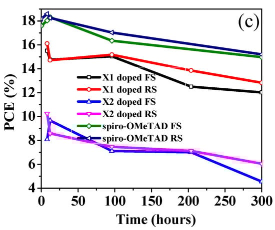 HTM plays a critical part in PSC devices, which could be viewed as a barrier for preventing water from entering the perovskite layer and stopping further consumption without encapsulation. Devices dependent on FTO/perovskite/HTM (doped) structures were utilized in the contact-angle testing. As displayed in Figure S6, the contact angles were 46.2°, 84.2°, and 73.5° for X1, X2, and spiro-OMeTAD, respectively. The hydrophobicity was decreased in the order of X2 > spiro-OMeTAD > X1. This indicates that inserting the thienyl group into the molecular structure led to better hydrophobicity of the X2 compared with the others, which might be because of its higher crystallinity and strong intermolecular interactions with the perovskite layer, which prompts unrivaled stability [72].