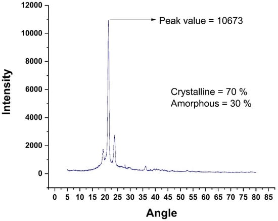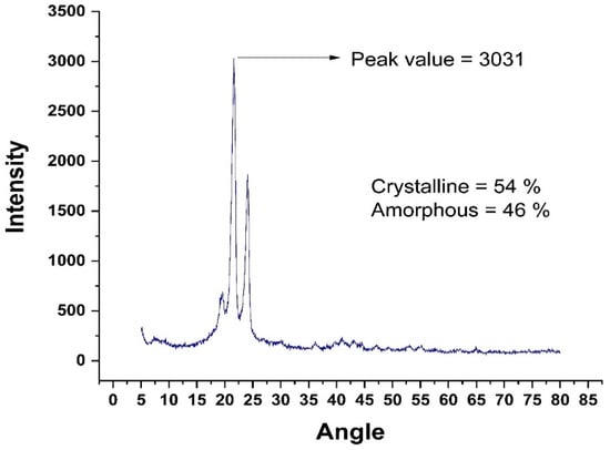 The X-ray diffraction (XRD) technique can be used to investigate the material’s structural information and forecast its mechanical response under various stress circumstances. XRD analysis was used to examine the effects of gamma radiation on RPW and IPW in this work. Flakes of 2–4 mm in diameter were fed into an X-ray diffractometer with a voltage of 20–40 Kev (Kilo Electron Volts). Using rays with a wavelength of 1.5418 (Angstrom), the sample spun in the apparatus, ensuring that each particle of the material was exposed to the radiation. The crystallinity of the sample was determined by plotting the intensities and rotation angle on a graph. The peak area is directly related to the degree of crystallinity. Integrating the areas of all of the curves yields a precise degree of crystallinity []. Gamma radiation has been shown to improve waste plastic’s mechanical qualities by enhancing its microstructure and making it crystallized. Table 2 shows the XRF analysis results for chemical composition. Figure 1 and Figure 2 refer to XRD analysis of radiated and irradiated plastic, respectively.