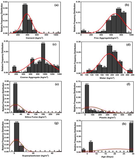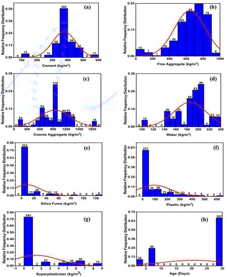 Compressive strength parameters’ relative frequency distribution; (a) cement, (b) fine aggregate, (c) coarse aggregate, (d) water, (e) silica fume, (f) plastic, (g) superplasticizer, and (h) age.