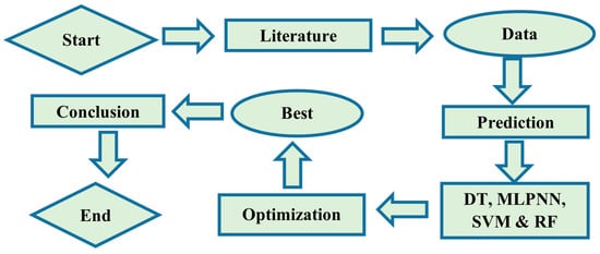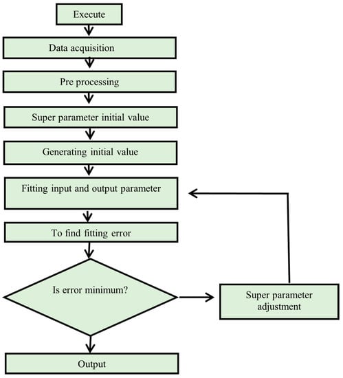 SVM is an input–output mapping supervised learning method provided by the dataset. Classification and regression problems are solved using SVM models. SVM, on the other hand, is mostly used to solve classification difficulties. In SVM, classification is accomplished by using a hyperplane to distinguish between two classes. Each data point is represented as an n-dimensional space point where n is the number of features you have with the value of each feature being the coordinate value. Following that, categorization is completed by analysing the hyper-plane, which clearly distinguishes the two classes []. Figure 8 illustrates the SVM flow chart.