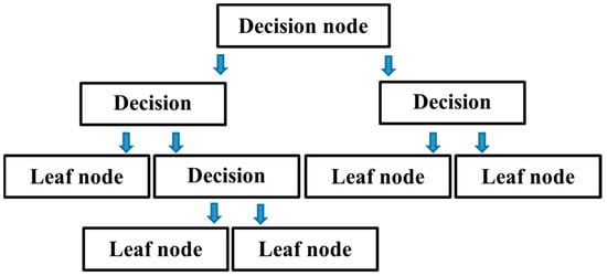 For regression and classification issues, DT is a method for predictive modelling that is used in AI. DT is a categorization scheme comprised of a series of if-else expressions. As seen in Figure 6, it is made up of several nodes, also known as leaves. Each leaf is subjected to a test, which sends a query to the node’s branches. The query will be looped until it reaches the terminal leaf. Each leaf node is correlated with the value returned as the tree’s contribution. This should be performed to construct the shortest feasible tree by prioritizing the most essential qualities. Division of learners after the first attribute, other learners come to be DT problems in their own right, although with fewer samples and fewer attributes. The complexity can be solved by using subtrees with fewer but more important properties. A node with a larger number of samples has a higher level of complexity. The complexity of a homogenous node is reduced because it has a sample of only one type. The objective is to create trees by repeatedly reducing the sample’s classes to achieve as pure leaf nodes as possible [].