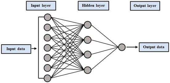 One of the most effective machine learning models is the ANN model. It has been frequently used in environmental, hydrological, and engineering investigations due to its potential to address nonlinear problems. The multi-layer perceptron ANN is the most extensively utilized of the many types of ANN models (MLPNN). The MLPNN model’s basic architecture consists of three layers: the input layer, one or more hidden layers, and the output layer. Purelin, logsig, and tansig are three typical activation functions. Weights, bias, and activations functions are the most significant components in the hidden and output layers. Model training determines the weights or model parameters. All of the hidden layers employed the tansig activation function, but the output layer used purelin. Fivefold cross-validation was used to find the best structure. The best ANN model was found to have three hidden layers, with the optimal number of neurons for each hidden layer being 9, 3, and 2, respectively []. Figure 7 shows a typical neural network. These networks are composed of three stages: the forward-pass transmits the input and multiplies it by weight, and the model output is predicted. The anticipated outputs are compared to the provided inputs. The output of the model predicts the results by considering the input parameters into account. Depending on our performance and objectives, we employ a variety of loss functions. Backward propagation generates partial-derivatives of the cost-function relating to the individual parameters back into the function. Back propagate loss and update the model’s weights using gradient descent during this process.