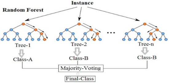The RF method consists of three main steps. It is used to gather trained regression trees using the training set, then to calculate the average of each regression tree’s output, and, finally, to perform cross-validation on the predicted data using the validation set []. A recent study by [] concluded about the random forest that in RF the average of the learners on the nodes and the mean square error (MSE) produced among each learner were determined at each branching of the regression tree. The regression tree will stop growing if the minimal leaf node MSE is used as a branching condition until no more features are available or the total MSE is optimal. The number of regression trees and the number of random variables of nodes are two crucial custom factors. Figure 9 depicts how RF works based on classes and trees.