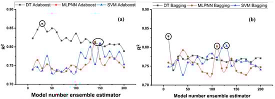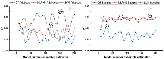 R2 for tensile strength ensemble models with the different sub-models; (a) Adaboost; (b) Bagging.