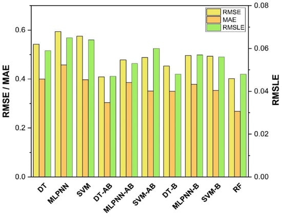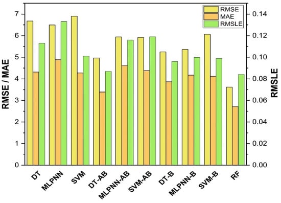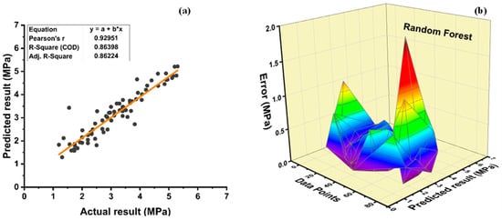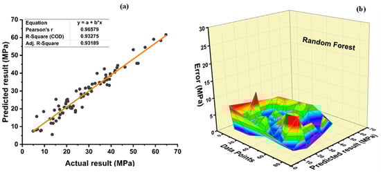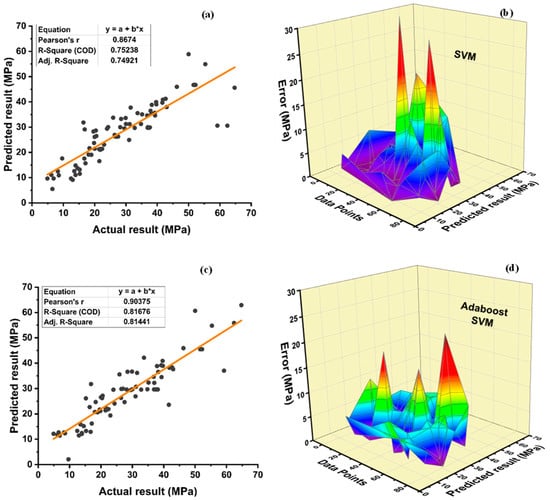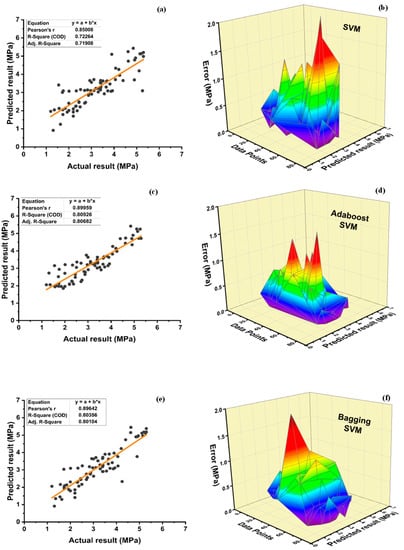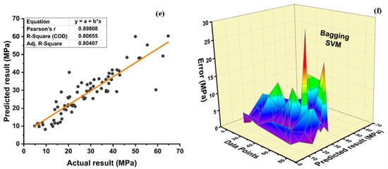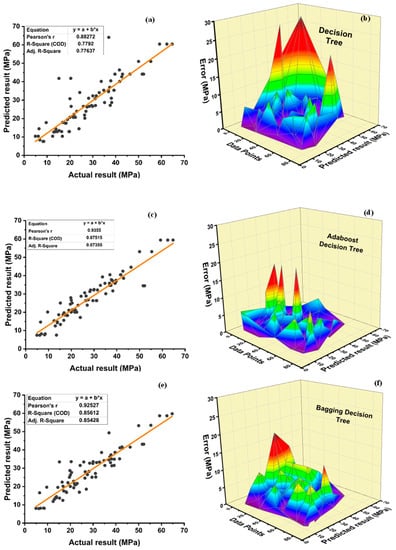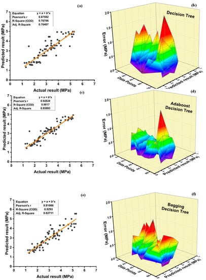 Figure 13a,c,e depicts the model performance versus actual fsts results, while Figure 13b,d,f depicts the error between actual and predicted values. Boosting ensemble algorithm improved individual DT model of fsts from R2 = 0.767 to R2 = 0.862. The average, maximum and minimum values of individual DT models for fsts are 0.4 MPa, 1.92 MPa, and 0.013 MPa, respectively. The average, maximum, and minimum values are observed to be 0.30 MPa, 1.69 MPa, and 0.002 MPa, respectively, for the best ensemble DT-adaboost model and 0.35 MPa, 1.25 MPa, and 0.001 MPa for best ensemble DT bagging model. This shows an enhancement of 25, 12, and 84.62% in average, maximum, and minimum errors, respectively, using adaboost ensemble algorithm for fsts. Similarly, there is an improvement of 12.5, 34.9, and 92.3% in average, maximum, and minimum errors, respectively, using the bagging ensemble algorithm for fsts. Moreover, individual DT model data shows an error of 90% below 1 MPa, and 10% error between 1–2 MPa. Similarly, DT-adaboost model data illustrates an error of 98.75% below 1 MPa and 1.25% error between 1 and 2 MPa. For the bagging ensemble DT model, data depicts an error of 96.25 below 1 MPa, and 3.75 between 1 and 2 MPa.