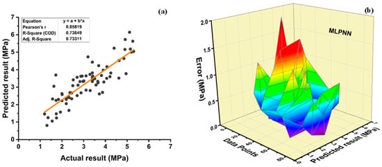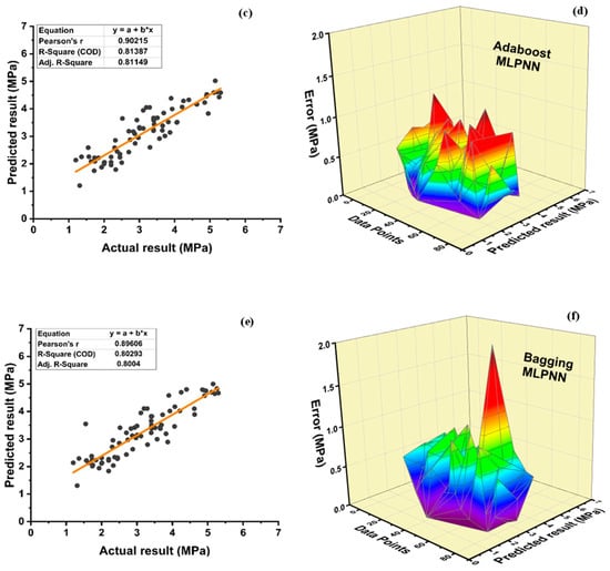 MLPNN is modelled in the same way as the decision tree, adopting ensemble learner’s methods, as shown in Figure 14. Figure 14a illustrates the relation among predicted and experimental values for individual MLPNN model of plastic concrete having R2 = 0.78, along with its error-distribution, illustrated in Figure 14b. Best boosting and bagging ensemble algorithm MLPNN sub-model is selected, analysed, and compared with individual MLPNN model. The individual MLPNN model demonstrates a maximum error of 18.97 MPa and minimum error of 0.029 MPa, indicating an average error of 4.89 MPa. Furthermore, data illustrates error of 63.75% below 5 MPa, 20% from 5 to 10 MPa, 13.75% from 10 to 15 MPa, and 2.5% from 15 to 20 MPa. Moreover, this model is enhanced by an ensemble adaboost algorithm that depicts R2 of about 0.81, as illustrated in Figure 15c. Additionally, Figure 14d shows an average, maximum and minimum values of error of 4.61 MPa, 17.66 MPa, and 0.07 MPa, respectively, for MLPNN best ensemble adaboost fc’ model. Moreover, 68.75% of the data depict error below 5 MPa, 22.5% from 5 to 10 MPa, 7.5% from 10 to 15 MPa, and 1.25% from 15 to 20 MPa. The bagging algorithm enhanced fc’ MLPNN model with R2 = 0.85. Figure 14f for bagging ensemble MLPNN model illustrates an average, maximum, and minimum values of error of 4.17 MPa, 16.45 MPa, and 0.04 MPa, respectively. Furthermore, 66.25% of the data show the error below 5 MPa, 26.25% from 5 to 10 MPa, 6.25% from 10 to 15 MPa, and 1.25% from 15 to 20 MPa.