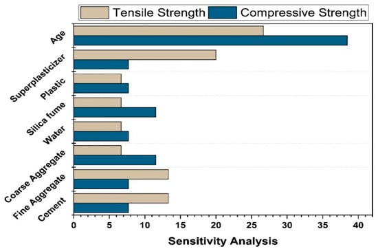 Sensitivity analysis is a useful tool for determining the significance of each input to the results. In most real-world applications, identifying all input variables that influence the problem’s results is difficult. Sensitivity analysis is a neural network technology that identifies all important parameters from a list of potential parameters efficiently. After training the neural network on the complete dataset, sensitivity analysis is performed []. As input parameters, eight factors were used: cement, water, CA, FA, SP, SF, age, and plastic waste. The influence of every constituent in the production of ensemble models is illustrated in Figure 22. When compared to FA, cement, and other additives, silica fume, coarse aggregate, and age have been demonstrated to contribute more towards compressive strength. Although, for fsts models, CA and water are the least sensitive parameters. The most influential parameters for fsts models include super plasticizer and age. In the creation of both models, FA played a moderate influence.