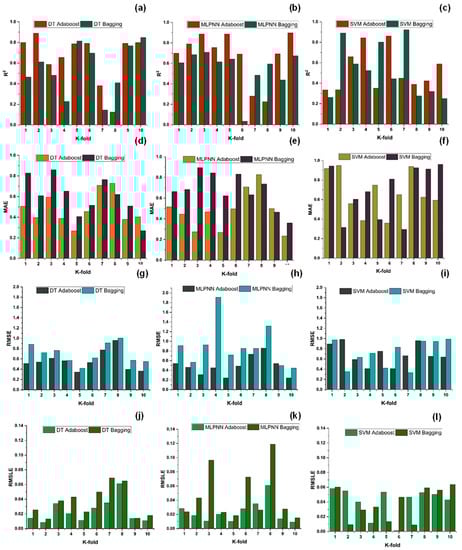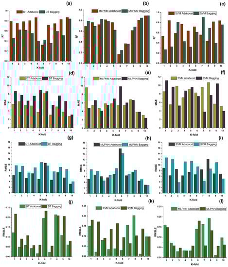 Tensile strength models (a–c) indicates R2 models’ result validated with K fold; (d–f) indicates MAE models’ result validated with K fold; (g–i) indicates RMSE models’ result validated with K fold; (j–l) indicates RMSE models’ result validated with K fold.