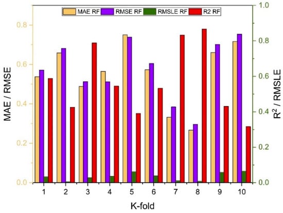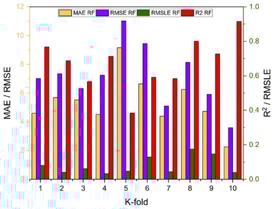 As indicated in Figure 23, Figure 24, Figure 25 and Figure 26, the results of cross-validation are expressed as R2, MAE, RMSLE, and RMSE. In comparison to supervised machine learning approaches, the RF model has fewer mistakes and a higher R2. The average R2 value for RF modelling is 0.674 for a tenfold increase in fc’, with a minimum value of 0.39 and a maximum value of 0.92, as illustrated in Figure 24. As indicated in Figure 26, the average R2 value for fsts is 0.57, with a minimum value of 0.32 and a maximum value of 0.87. Each model exhibits less validation mistakes. The validation indication indicates that the mean values of RMSE, MAE, and RMSLE for the fc’ RF model are 5.37, 7.11, and 0.083, respectively, and for fsts RF model are 0.56, 0.58, and 0.035, respectively. Similarly, other ensemble models used in this study exhibit the same tendency, but with far larger errors.