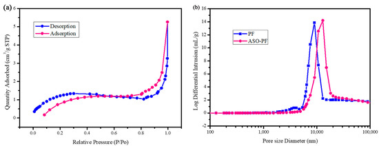 (a) N2 adsorption-desorption isothermal curves of ASO-PF and (b) pore size distribution curves of PF and ASO-PF.