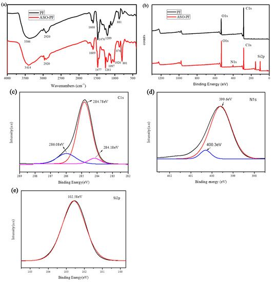FTIR spectra (a), XPS spectra (b) of PF and ASO-PF and high resolution C1s (c), N1s (d), and Si2p (e) spectra of ASO-PF.