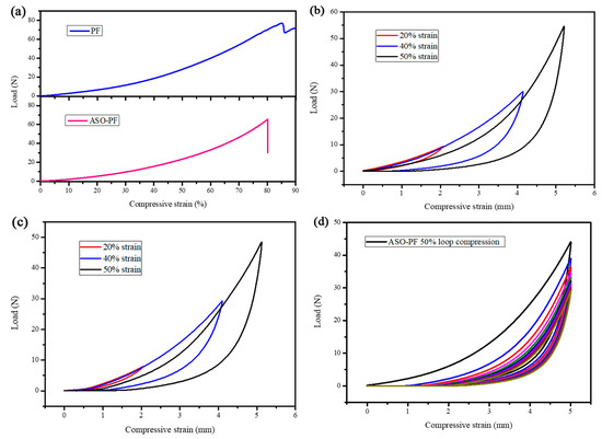 Compressive stress–strain curves of PF and ASO-PF. (a) Maximum compressive deformation of PF and ASO-PF, (b,c) stress–strain curves for 20%, 40%, and 50% compressive deformation of PF and ASO-PF, respectively, and (d) stress–strain curves for cyclic compressive 50% deformation of ASO-PF.