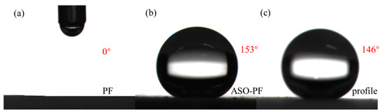 Water contact angle (WCA) of PF and ASO-PF: (a) WCA of PF xerogel surface, (b) WCA of ASO-PF xerogel surface, and (c) WCA of ASO-PF xerogel profile.