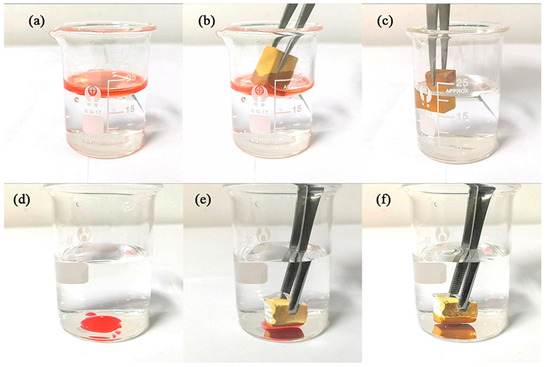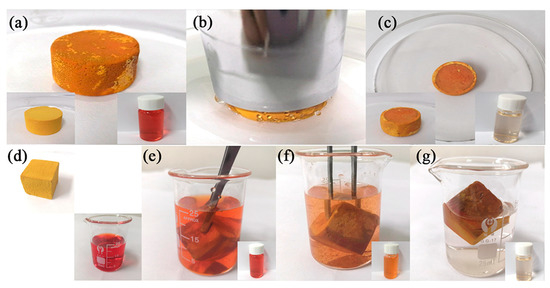 In order to better show the respiratory adsorption mode of the xerogels to organic pollutants in homogeneous solutions before and after modification, the selectivity of PF and ASO-PF xerogels to dyes and water was investigated using Congo red stain as an example. As shown in Figure 8a–c, when the unmodified PF xerogel adsorbed the dye, Congo red and water were adsorbed into the interior of the xerogel without any difference. Since the PF xerogel itself is composed of organic skeleton, it has a certain adsorption capacity to the organic phase in water. When the PF xerogel is compressed, the water inside is extruded, and the Congo red is trapped in the organic skeleton, and the extruded water is colourless and transparent. From the wetted filter paper underneath the xerogel, it can be seen that there is basically no residue of Congo red stain in the extruded water. The modified ASO-PF xerogel was placed in the same quantity of Congo red dye, and owing to its superhydrophobicity, ASO-PF absorbed Congo red dye in water preferentially. Congo red dye was continually absorbed into the inside of the ASO-PF xerogel and trapped by the internal pores by continuous extrusion and release. Water is evacuated with the extrusion due to the hydrophobic characteristics of the whole skeleton. Figure 8d–g also show that as the ASO-PF is constantly compressed and released, the Congo red dye is gradually absorbed and the solution becomes colourless and transparent. Simultaneously, ASO-PF continues to float on the liquid surface after numerous cycles of extrusion beneath the liquid surface, demonstrating ultra-hydrophobic properties. To recycle the dye on the surface of the adsorbed ASO-PF xerogel, immerse it in acetone.