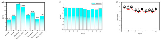 Organic solvents and petroleum pollution are the major contributors to industrial wastewater and marine pollution in environmental management. Different organic solvents were selected as target organic pollutants to evaluate the adsorption capacity of ASO-PF xerogels. For this two-phase wastewater solution, direct static adsorption can be collected. The adsorption capacity of the modified ASO-PF was up to 13 times its own mass under static adsorption, as shown in Figure 6g, and remained stable for several cycles (Figure 6h). Even at lower densities, the adsorption capacity of n-hexane could reach 5.3 g·g−1, and the dynamic adsorption experiments of ASO-PF were characterized by adding drops of Sudan red-stained n-hexane and dichloromethane to water, respectively. ASO-PF rapidly adsorbed hexane on the water surface and dichloromethane beneath the water, as shown in Figure 6a–f. The xerogel exhibits the silver mirror phenomenon in water, and due to its superhydrophobic property, there is a water film wrapped on the surface of the xerogel when it is clamped deep into the water with tweezers, achieving the purpose of isolating the surrounding water and allowing it to maintain a long and stable hydrophobic state in water. To verify this conclusion, an adsorption–desorption experiment was conducted on ASO-PF, and the xerogel was saturated with n-hexane and then dried for 10 cycles to obtain the cyclic contact angle Figure 6i. After 10 cycles of adsorption-desorption, the xerogel could still maintain a water contact angle of about 150°, achieving a stable superhydrophobic effect, which is conducive to reuse in the field of wastewater treatment.