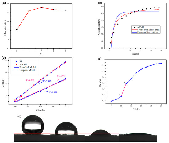 Adsorption behaviour of ASO-PF on phenol solution. (a) Effect of pH on the adsorption capacity of ASO-PF on phenol, (b) kinetic fitting of ASO-PF adsorption efficiency with time, (c) isothermal adsorption curve of ASO-PF adsorption capacity with concentration, (d) adsorption capacity of ASO-PF in high concentration phenol solution, and (e) contact angle of ASO-PF surface at a concentration of 12.5 g·L−1 of the contacted solution.