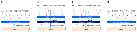 Another technique to improve the comfort of protective clothing is to use an impermeable material as a barrier for the outer part and a more breathable material for the inner part. To this end, semipermeable fabrics are designed (Figure 1C). In addition, a perm-selective membrane that allows the permeation of water vapor molecules but inhibits the passage of larger organic molecules (Figure 1D) can also be developed. Several materials, mostly polymers, have been used for these semipermeable or selectively permeable membranes (SPMs), such as poly(vinyl alcohol), cellulose acetate, cellulosic cotton, or poly(allylamine). The development of different membranes for protective textiles has been thoroughly reviewed, from the barrier films and breathing membranes to the future directions that advocate the use of selectively permeable barriers, which are schematically represented in Figure 2.