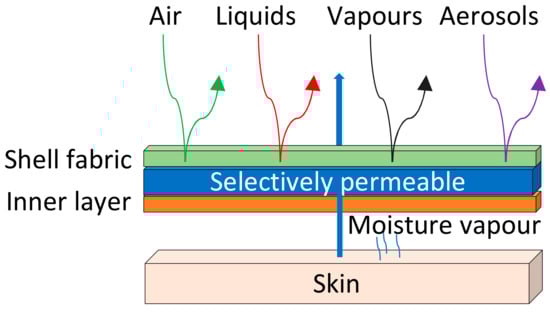 Completely impermeable suits can be achieved by film-laminated fabrics as a full hazardous barrier (Figure 1A). However, these do not meet the comfort requirements after a long operational time, as the water vapor permeability is high, which causes heat stress for the wearer.