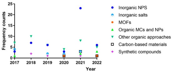 Figure 3 illustrates the current trends in the use of different types of antimicrobial agents within protective textiles, for military use or otherwise. It presents approximate frequency counts of the use of these materials within the published literature of the last 5 years (database: Scopus). Inorganic NPs are the major contributors to these numbers, but natural approaches fall shortly behind. Of the former, Ag-based strategies are the most commonly explored. On the other hand, research using natural biocidal approaches is highly unfocused, even though many studies explore plant extracts, CS and derivatives, CS-based architectures, and plant-extract-loaded CS-based small-scale particles. However, it becomes clear that the quest to find suitable bioactive agents has been narrowing over the years, with bioactive agents such as ZnO or CuO NPs gaining more importance lately. Besides, MOFs as well as carbon-based materials such as CQDs and graphene derivatives emerged around 3 years ago for this type of application. In addition, natural approaches have appeared, emphasizing the potential of CS, particularly if processed in the form of small-scale particles carrying biomolecules such as plant-derived compounds.