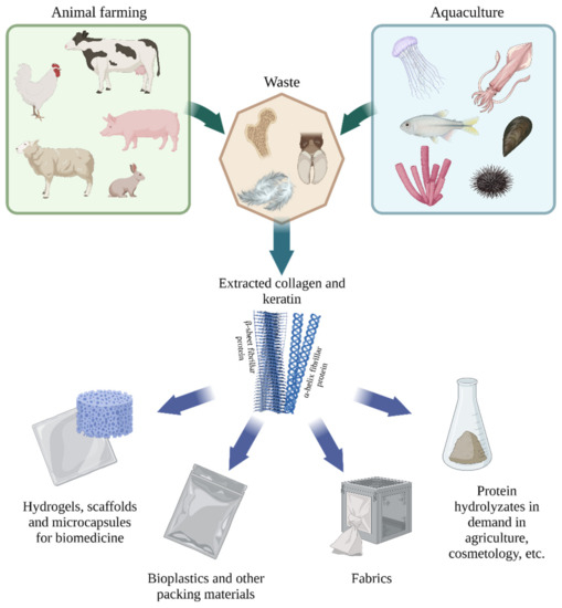 Current trends in the transition to the use of green materials in all areas of human life are pushing scientists to search for new polymers that would replace petrochemical-based ones, be sustainable, but not inferior in strength, elasticity, and wear resistance. Collagen and keratin are one such alternative. In addition to their biochemical and physical properties, their availability and low cost of the material from which these proteins are obtained—animal farming and aquaculture waste, are also important. Fibrillar proteins can be extracted from agricultural by-products using various methods, such as chemical, thermal, and enzymatic hydrolysis, steam explosion and microwave technique [2,6,49]. Each of these approaches has some advantages and disadvantages and provides proteins with certain characteristics that meet the needs of different economy areas. For example, collagen and keratin find wide application in biomedicine due to its properties such as porosity, strength, and high biocompatibility [50,51,52,53,54].
