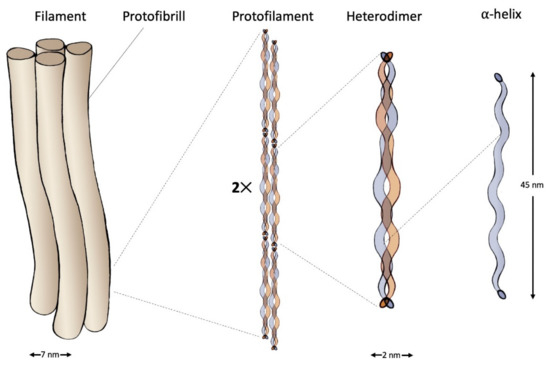Wool keratins are divided into two fractions: low-sulfur that represented by intermediate filaments, and high-sulfur or KAPs. Two groups of IF-keratins exist: type I (acidic keratins) and type II (basic keratins). The molecular weight of these proteins ranges from 40 to 70 kDa. Their structure contains the C- and N-terminal domains, as well as the alpha-helical rod domain. Molecules of type I and type II keratins form heterodimers with left-handed coiled-coil structure maintained by the presence of heptad repeats rich in apolar amino acids such as leucine, isoleucine and valine in the rod domain. The mature intermediate filament consists of 4 protofibrils, each of which contains 2 protofilaments including 2 keratin heterodimers [23,30,31] (Figure 2).