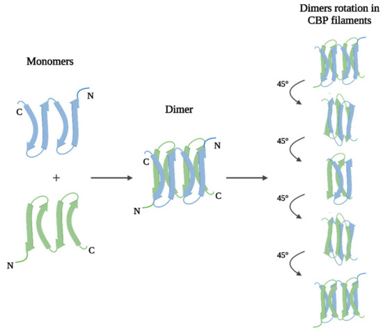 As noted earlier, both keratins and CBPs can be found in derivatives of the epidermis of birds and reptiles, but beta proteins predominate, including in feathers. CBPs have a molecular weight from 8 to 25 kDa and, like IF-keratins, consist of three main domains: the central, N- and C-terminal. However, unlike true keratins, the molecules of CBPs are both filament- and matrix-forming at the same time. The central domain, which comprises a homologous for all Archosaurs and Squamates sequence of 34 amino acid residues, usually forms an antiparallel (more stable than parallel) beta-sheet of four beta-strands. Beta-sheet dimers constitute a helical structure filament due to a rotation of approximately 45° [33,34,35], (Figure 3).