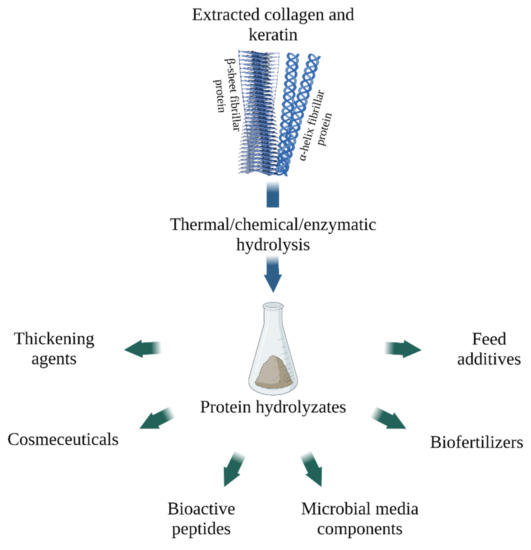 Collagen and keratin hydrolysates, which include oligopeptides and amino acids, are in demand in various areas of the economy. For its obtaining, a wide range of approaches is used, for example, thermal, acidic or alkaline hydrolysis. Increasingly, however, researchers are resorting to the enzymatic production of hydrolysates, as it is a sustainable method that allows better control over the composition of the resulting mixtures [165,166], (Figure 5).