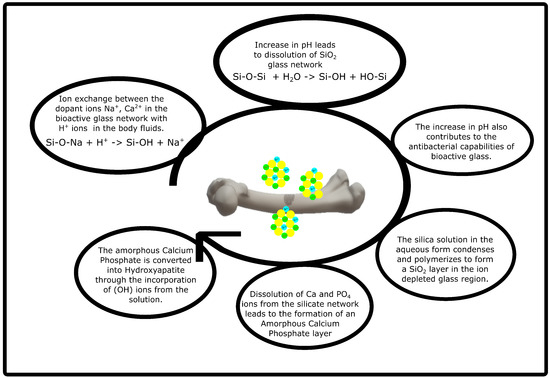 For the development of new polymer/bioactive glass composites, the bone regeneration mechanism of bioactive glass needs to be studied. The mechanism of apatite layer formation has been widely understood using Stimulated Body Fluid (SBF); however, little is known about the mechanism at the interface between the apatite layer and bone tissue [10]. The steps of the mechanism of apatite formation can be explained in Figure 1 [10,46].