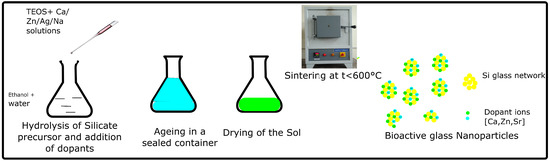 The sol-gel synthesis of bioactive glass can be performed at a temperature of 30 C. In sol-gel synthesis, the precursors, such as tetraethyl orthosilicate, are hydrolyzed and mixed with solutions of ions, such as Ca, Zn, Na, Ag, and Cu. The sol is then aged to form a gel and dried to evaporate the alcohol. The gel is then sintered at temperatures below 600 C to obtain bioactive glass nanoparticles. By adjusting on the pH of the hydrolyzing medium and the concentrations of the dopant ions and surfactants (such as ammonia solution or cetyltrimethylammonium bromide), it is possible to control the size of the particles obtained [51].