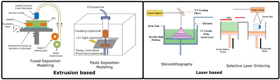 With advancements in additive manufacturing technologies and imaging techniques, such as CT scans, it is now possible to design and print customized scaffolds [59]. Additive manufacturing or 3D printing is a manufacturing method adopted for the automated layer-by-layer fabrication of complex geometries using computer-generated models [60]. According to ASTM F2792 standards, there are seven families of 3D printing technologies, of which extrusion-based, or laser-based 3D printing is widely used for bone tissue engineering (Figure 3).