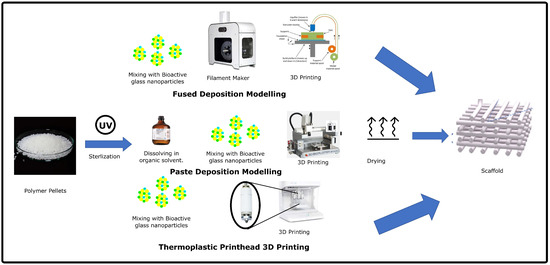 Thermoplastics are suitable for 3D printing via both FDM and PDM. For FDM 3D printing of biofilaments, the polymer pellets are sieved and sterilized to eliminate contaminants that may affect scaffold cytotoxicity. The bioactive glass particles are then mixed with the pellets using a mixer. The mixture is then fed into a filament extruder to obtain a uniform printable filament. For PDM 3D printing, polymer pellets are dissolved in water or an organic solvent to prepare a paste. Bioactive glass nanoparticles are loaded into the paste and used for printing. After printing, the scaffold is dried to evaporate the solvent. In some modern 3D bioprinters, a thermoplastic polymer powder is loaded with bioactive glass nanoparticles and used directly to print the filament or prepare the paste. Figure 4 shows the different strategies for 3D printing of polymer-bioactive glass composites and the steps involved.