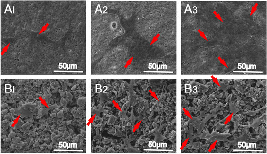 SEM images of hBMSCs attached on (A) MBG/SF and (B) MBG/PCL scaffolds for (A1,B1) 1, (A2,B2) 4, and (A3,B3) 7 days. The red arrows indicate cells. Reproduced from [105] under copyright CC BY licence.