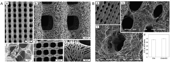 Chitosan is a positively charged polysaccharide; when combined with bioactive glass, it improves the mechanical and biological properties of the biomaterials. Chitosan is one of the most widely used biomaterials for bone tissue engineering because it also induces cell differentiation. In a previous study, bioactive nanoglass was dispersed in distilled water and mixed with chitosan solution. The ink was loaded into a syringe with a heating jacket maintained at 37 °C. The 3D-printed bone scaffold was deposited into a dry-ice cooling bath to allow solidification. The morphology of the scaffolds revealed the formation of aligned macrochanneled pore structures with diameters of approximately 10 µm (Figure 7A) [107].