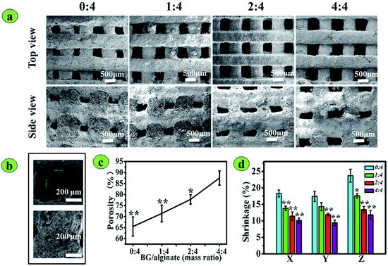 The morphology, porosity, and shrinkage of 3D-printed BG/SA composite scaffolds: (a) Top and side-view SEM images of the scaffolds. The BG/SA mass ratios were 0:4, 1:4, 2:4, and 4:4. (b) High- magnification SEM images showing a pore and a vertical section of strands of the BG/SA 2:4 scaffold. (c) Porosity. (d) Scaffold shrinkage (%) in the X, Y, and Z directions. Reproduced from [108] under copyright CC BY-NC 3.0.