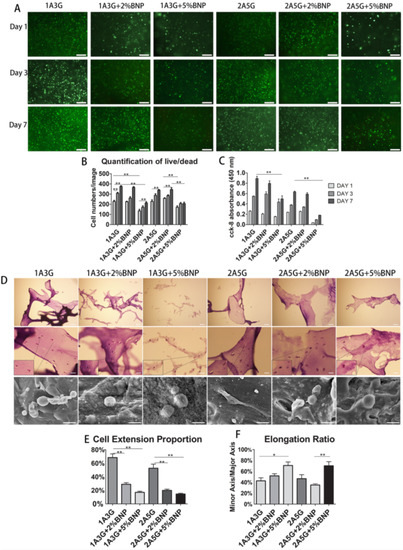 Cellular morphology of MSCs after treatment with different compositions of bioink. (A) Images representing live/dead cells in each bioink treatment groups at day 1, 3, and 7. (B) Quantitative analysis of the number of live cells. (C) Absorbance value at OD 450 nm in the CCK-8 cell proliferation assay. (D) Hematoxylin and eosin staining images depicting MSC spreading phenomenon. (E,F) Quantitative analysis of cellular extension and cell aspect ratio of extended cells, respectively. Reproduced from [109] with permission from Copyright 2019, Elsevier).