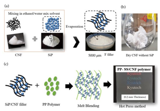 Polypropylene (PP), as a polymer matrix, was obtained from Japan Polypropylene Corporation, Tokyo, Japan (Polypropylene FY-6, MFR 2.5 g/10 min, CrI 59.80%). It has melting point of 162 °C, crystallization temperature of 104 °C and degradation temperature of 461 °C. Cellulose nanofibers (5 wt% aqueous dispersion, DP 650) were provided from Sugino Machine Limited, Toyama, Japan. The CNFs were produced by a super high-pressure water jet system. SiP powders, Sylosphere 200 (SS, diameter 3.0 µm) and Sylophobic 200 (SP, diameter 3.9 µm) were supplied from Fuji Silysia Chemical, Aichi, Japan. The ethanol (>99.5%) was purchased from Wako Pure Chemical Industries Ltd., Osaka, Japan, and reverse osmosis (RO) water was used throughout the experiments.