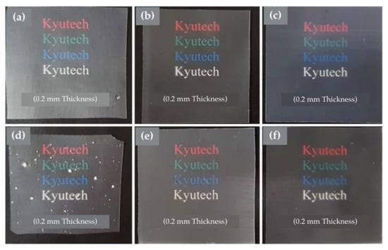 The effect of different types of silica and CNFs on optical properties was elucidated. The PP composite was melt-blended through a twin-screw extruder. Figure 4 shows the PP composite after melt-blending and hot-pressing for analyses and the study of mechanical properties. Pristine PP (Figure 4a) acted as a reference. Figure 4b,c demonstrates the PP composite with SiP SS and SiP SP, while Figure 4e,f shows the PP-SS/CNF and PP-SP/CNF composites. Figure 4d presents the PP composite with only CNFs as the filler.