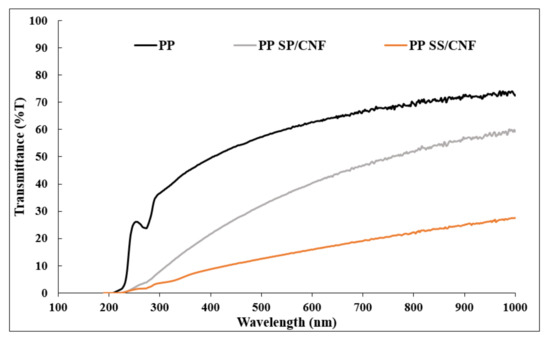 The UV-visible spectra of PP nanocomposites were analyzed in the wavelengths between 200 and 800 nm. Based on data given in Table 2, the transmittance of plain PP was about 65.3 %T at 660 nm. After adding the hybrid fillers, the transmittance value was reduced. The transmittance efficiency decreased due to blocking by the hybrid filler. The dispersity of the reinforcement will affect the transparency of the nanocomposite. The transmittance level of the PP SP/CNF (44.6 %T) was higher than the PP SS/CNF (19.9 %T), even provided the same hybrid filler loading level. This scenario was due to the higher hydrophobicity of SP making it easier to incorporate with the hydrophobic PP polymer matrix.