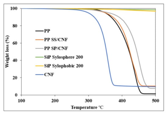 Figure 10 shows the thermal stability of the neat PP, SiPs, CNFs, and PP composite. The TGA results show the neat PP and PP composite degradation in a single step of degradation. SiP SP had weight loss at 420 °C, attributed to the thermal decomposition of the functional group of polyalkyl siloxane. Above 450 °C, there was no weight loss observed for either SiP sample, indicating residual SiPs. Further, SiPs have high thermal stability at temperatures up to 800 °C [37]. For the CNF sample, weight loss started from 270 °C due to the thermal decomposition of cellulose [38]. The TGA result also showed the neat PP almost degraded without any char formation, with the residual of the original sample mass being only 1.3%.