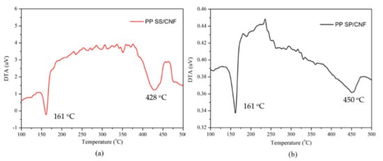 Additionally, the DTA curves of the discussed composite PP SS/CNF and PP SP/CNF show that during their decomposition, endothermic reactions occurred (Figure 11). The DTA curve exhibited two endothermic events. The first is attributed to Tm at around 161 °C, corresponding to the melting of the crystalline phase in the studied polymer (PP). Other endothermic peaks were observed with decomposition maxima at 428 and 450 °C in higher temperature ranges. The thermal decomposition of PP SP/CNF is higher than PP SS/CNF.