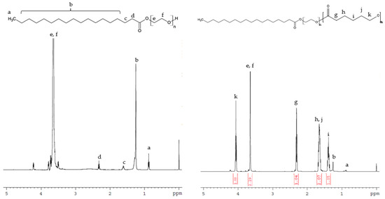 Representative 1H NMR spectra of Myrj S100 (left) and Myrj S100-b-PCL88 (right).