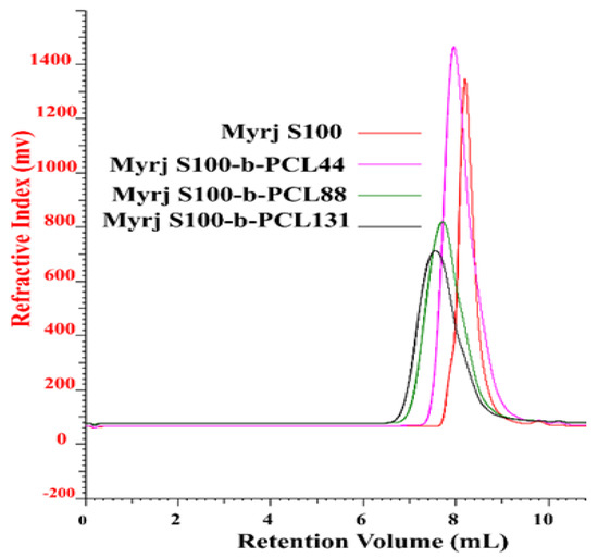 GPC analysis further confirmed the successful synthesis of Myrj-b-PCL with dispersity (Ð) ranging from 1.34–1.67. Figure 3 and Figure S2 show the GPC chromatograms of Myrj S40-b-PCL and Myrj S100-b-PCL copolymers, respectively. The retention volumes for Myrj S100 appeared at 8.0 mL. However, as expected, the peaks for all synthesized Myrj S100-b-PCL copolymers shifted to lower retention volumes (higher molecular weights). Each copolymer appeared as a single peak, which confirms that the polymerization reaction was successful. The molecular weights of the synthesized copolymers were calculated based on the prepared calibration curve using polystyrene standards. The GPC data for all the synthesized copolymers are presented in Table 1.