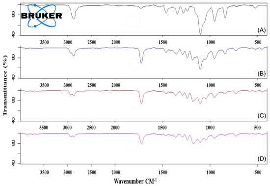 FTIR spectra of Myrj S100 (A), Myrj S100-b-PCL44 (B), Myrj S100-b-PCL88 (C), and Myrj S100-b-PCL131 (D).