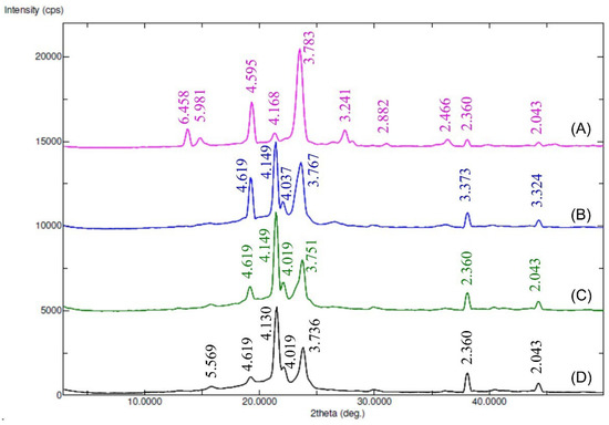 XRD diffractograms (peaks with d-values) of Myrj S100 (A), Myrj S100-b-PCL44 (B), Myrj S100-b-PCL88 (C), and Myrj S100-b-PCL131 (D).