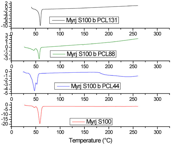 DSC thermograms of Myrj S100, Myrj S100-b-PCL44, Myrj S100-b-PCL88, and Myrj S100-b-PCL131.