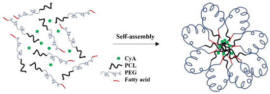Several water-miscible organic solvents were used (including acetonitrile, tetrahydrofuran, and acetone) to prepare micelles using the cosolvent evaporation method. Despite several attempts to prepare micelles using different organic solvent-to-water ratios as well as other methods of preparation (e.g., film-hydration method), none of the drug-free or CyA-loaded Myrj S40-b-PCL copolymers formed micelles with an acceptable yield or size. On the other hand, both Myrj S100-b-PCL88 and Myrj S100-b-PCL131 copolymers formed micelles with mean diameters <200 nm and with good yield (minimal or no precipitation). The only difference between Myrj S40 and Myrj S100 is the molecular weight PEG. Myrj S40 has 40 repeating units of PEG (i.e., PEG molecular weight = 1760 Da), whereas Myrj S100 comprised 100 repeating units of PEG (i.e., PEG molecular weight = 4400 Da). It seems that a PEG chain longer than 40 (MW > 1760 Da) was needed to provide the necessary folding to bring the stearate moiety (hydrophobic) in proximity to PCL, the core-forming block, during micelle formation in water. It is believed that this would be the thermodynamically favorable orientation for Myrj-b-PCL copolymer during the micellization process in the aqueous phase (Figure 7), which would be similar to the one reported for flower-like micelles formed from A-B-A triblock copolymers, where B is the hydrophilic block (e.g., Pluronic-R) [27]. In fact, this is similar to what we have observed and recently reported with α-tocopheryl polyethylene glycol succinate-b-PCL copolymers, where the micelles only formed when the molecular weight of PEG was higher than 2000 Da [6]. Nonetheless, this is only a hypothetical model that needs to be verified. Further studies are needed to investigate the conformation of these micelles in water (e.g., by using 1H NMR in D2O) [28,29] and to examine the morphology of the self-assembled structures in water (e.g., by using cryogenic TEM or atomic force microscopy) [30,31].