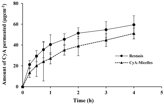 The permeation of CyA from Restasis® seemed higher initially (up to 1 h) as compared to CyA-Micelles, but overall, the total permeated amount of CyA through the excised rabbit cornea was comparable for the two formulations (p > 0.05, Student’s t-test). From the permeation profile, it was concluded that CyA-Micelles may provide sustained delivery of the loaded CyA from the micelles compared to that of Restasis®.
